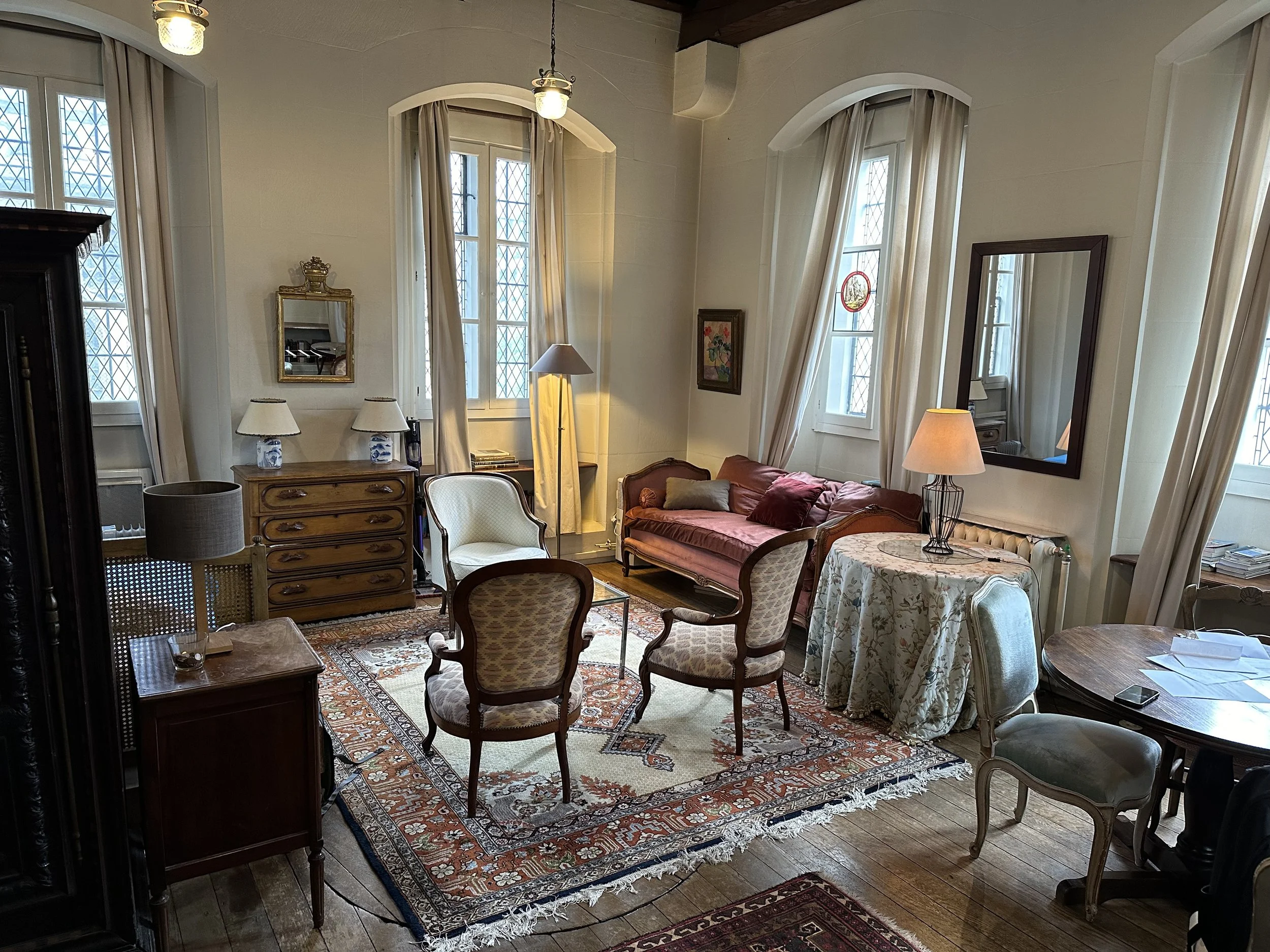 A guest space can be very relaxing when sparse and clean with simple lines, but you might consider adding some beauty in art, decorative pieces, or fresh flowers. The church tower apartment where we stayed in Paris (pictured below) was a lovely respite (the 28”-sq shower stall notwithstanding😊). A genuine spirit of warm hospitality, as offered by our hosts on this trip, makes all the difference.