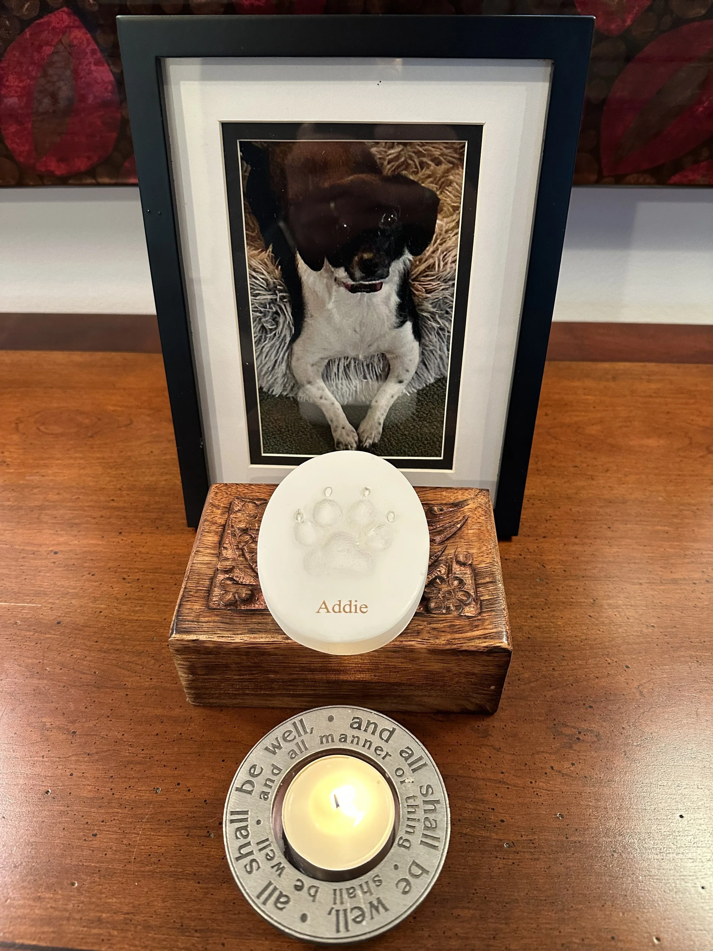 For solace, you might keep a reminder of what you lost close at hand. This picture shows items from our dog, Addie, who died unexpectedly last month. Addie wasn’t the most significant loss that we’ve experienced in recent weeks, but her death knocked the wind out of my sails. I’m amazed how quiet the house is without her, and how much I miss her.